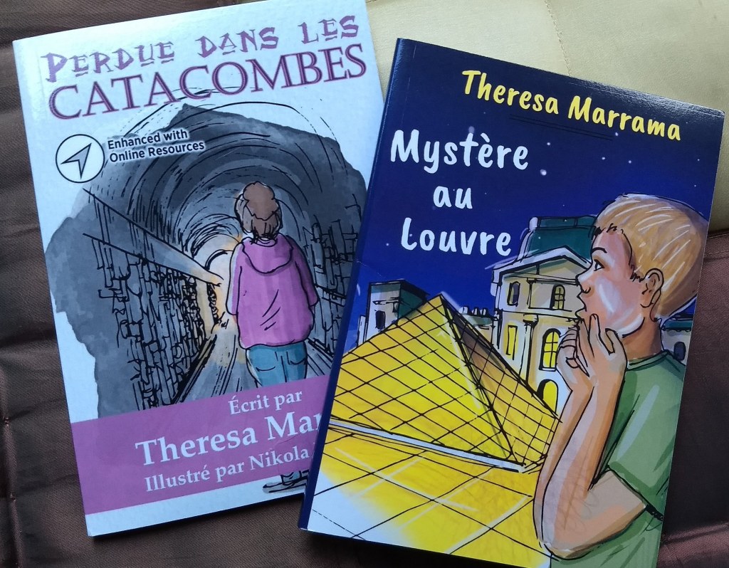 Towards the end of the year I knew we would have a few extra weeks after we finished the textbook, so we transitioned to reading French language readers designed for Intermediate readers. We used two books written by Theresa Marrama: Mystere au Louvre and Perdue dans les Catacombes. Catacombes had online review questions at the end of each chapter which were great for reading comprehension — Sunshinegirl found them easy to do. For Louvre, I had her narrate each chapter in English to ensure she understood what was going on. Neither book gave her any trouble — both she knew exactly what was going on. Perfect for French 2. She was even excited about the Catacombes in general and so she did a short report (en Francais) on them. Bonus! Both books are available at Theresa’s site, other TPS sites, and on Amazon.