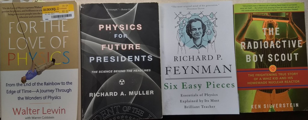 - For the Love of Physics by Walter Lewin (professor at MIT — look up his lectures on YouTube): This book has chapters on most “standard” Physics topics — the author explains the topics with the beauty and reality, and no math.